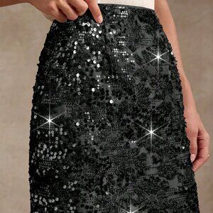 A sleek black midi skirt showcases a delicate jacquard sequined texture with a random print , while the split hem adds movement and a modern edge. Designed in a classic pencil silhouette, the regular fit drapes gracefully to a long length, making it adaptable for casual outings or elegant events. Subtle sparkle and refined detailing create a versatile piece that pairs effortlessly with tops, jackets, and accessories for a polished look.