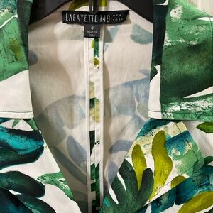 Keywords: Lafayette 148 blazer, floral blazer, green blazer, size 4 blazer, womens blazer, cotton blazer, leaf print blazer, tropical blazer, designer blazer, spring blazer, summer blazer, casual blazer, career blazer, bohemian blazer, statement blazer