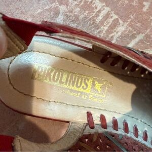 Beautiful Pikolinos genuine leather slingback shoes in a deep red color with intricate cutout woven detailing. Closed toe design with elastic slingback strap and a comfortable low wedge heel. Soft, flexible leather—classic Pikolinos quality.