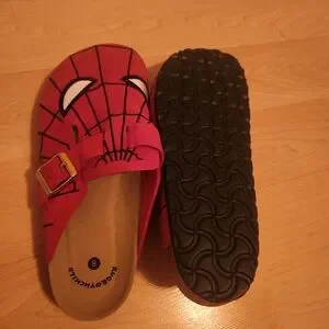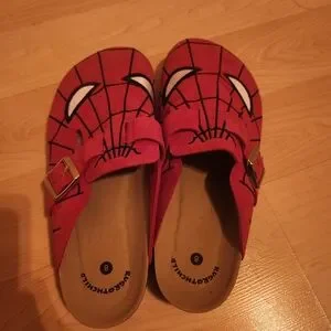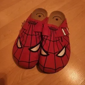 Bold red loafers with a unique spider design. Comfortable slip-on style. Perfect for casual wear.