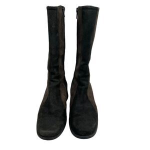 These Aquatalia two-tone brown suede boots offer premium weatherproof construction with rich color-block styling and a sleek wedge heel. Designed with an inside zip for easy on/off and a soft interior lining for comfort, these high-quality boots blend luxury craftsmanship with functional durability. A great pair for anyone who loves elevated, designer suede footwear with all-weather protection.
