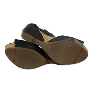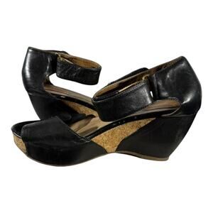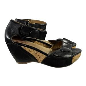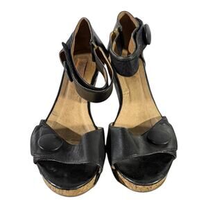 Miz Mooz Women’s 8.5 Black Leather Cork Wedge Sandals Ankle Strap Comfort Shoe