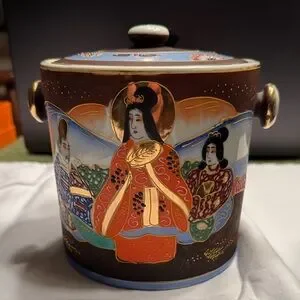 vintage Japanese Satsuma moriage porcelain covered biscuit jar.