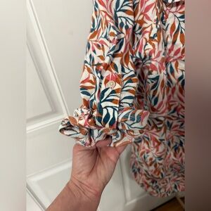 Stylish button-down with vibrant leaf pattern. Love the colors! Features a mix of beautiful colors. Ideal for a variety of outings. Sleeves can roll up or be worn down. 100% linen