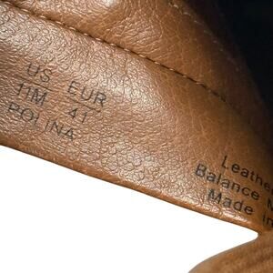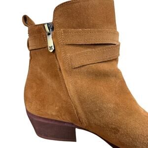 The product is a pair of Sam Edelman Polina suede leather chunky block heel ankle boots in size 11. These stylish booties feature a round toe shape, zip closure, and a mid heel height suitable for various occasions such as travel, casual outings, and business events. The brown suede upper material and leather outsole provide durability and a trendy look, making them a versatile choice for the winter, fall, and spring seasons. The cushioned insole and foam lining offer comfort and support for all-day wear, making these boots a practical and fashionable addition to any woman's wardrobe.