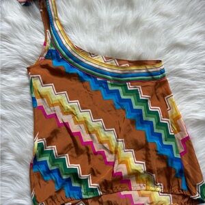Plenty by Tracy Reese 100% Silk Multicolor Zigzag Stripe One Shoulder Top Y2K