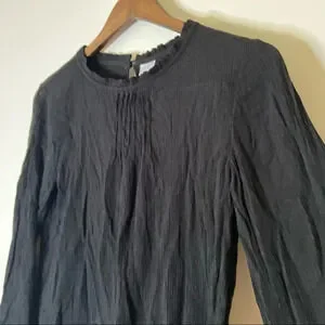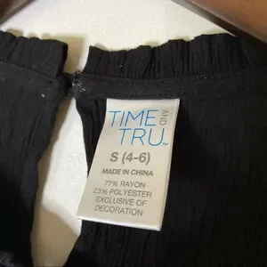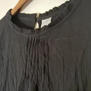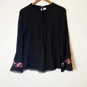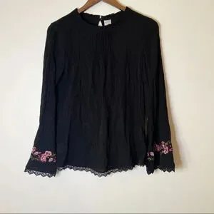 • features: This charming black long-sleeve blouse from Time and Tru features a feminine high neckline with a ruffle hem and intricate pink floral embroidery with lace trim. The lightweight, gauzy material and small pleated detail in the front create a delicate look. A tear-drop keyhole back opening with a button closure adds a unique touch, perfect for a Boho or Cottagecore aesthetic.