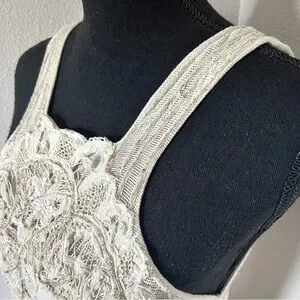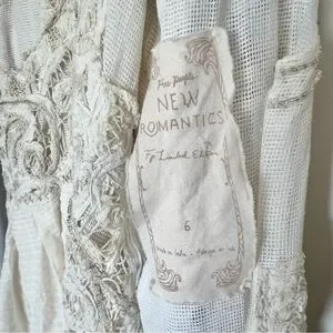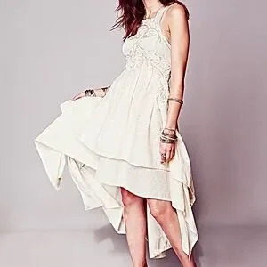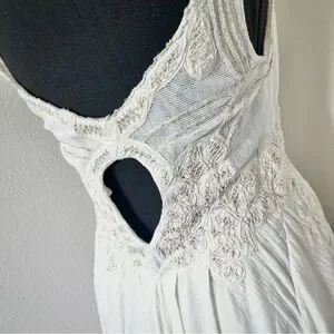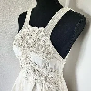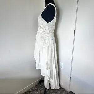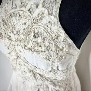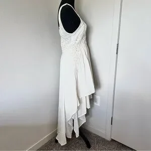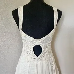 Rare Free People Limited Edition New Romantics Spring 2013 Dress, featuring breathtaking cream floral swirl crochet detailing interlaced on a white netted base, with gorgeous crisscross rope netting and fine branched beadwork through the straps and front and back bodice, a sweet little keyhole in the back, and a cream and white fine striped partial double layered handkerchief hem high-low skirt.