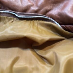Men's brown caramel colored long sleeved leather button up jacket, pockets, L.