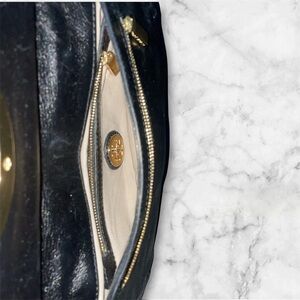 This sophisticated Tory Burch clutch features a sleek black leather design accented by a striking gold logo and a versatile gold chain strap, perfect for elevating any ensemble.