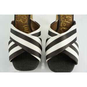 An Authentic pair of New Sam Edelman 'Mabel' black and white striped criss cross platform sandals in a size 9.5. A jute-wrapped peg heel lends earthy appeal to a cross-strap sandal supported by a recessed platform.
