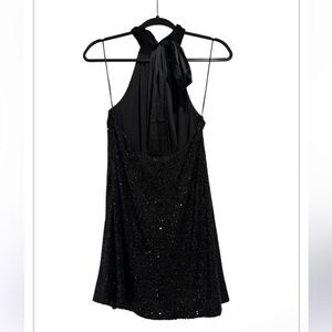 Elegant black mini dress with shimmering sequins. Halter neckline adds sophistication. Ideal for glamorous nights.