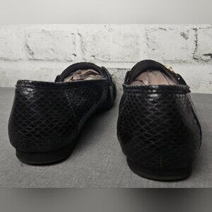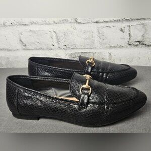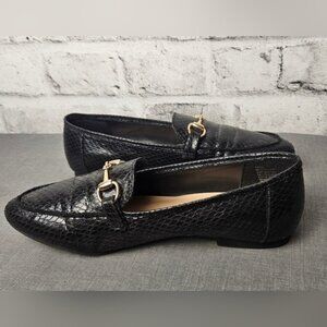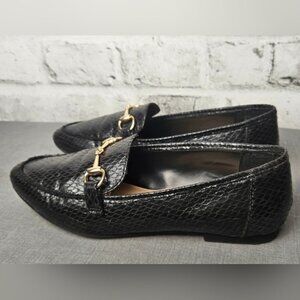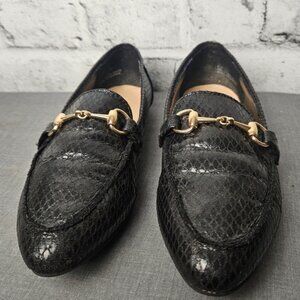 Chic Black Faux Snakeskin Loafers | Gold Bit Detail | Classic Size 8 Flats