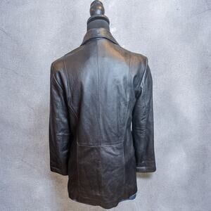 Gently used vintage condition. Genuine leather with full lining. The threading on the left pocket is partially detached so the edge is slightly coming away from the seam. It does not affect wear or structure and can be easily reinforced if desired. No other flaws noted. Soft leather with a classic longline blazer fit.