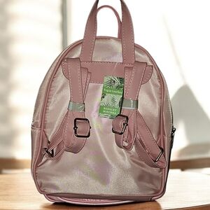 Elegant pink nylon backpack with silver logo. Features front zip pocket and adjustable straps.