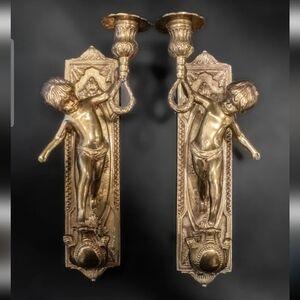 The pair of wall-mounted candle holders feature charming putti cherub angels, a detail that speaks to the craftsmanship and style of the antique period. Their robust construction and classic design make them not just a decorative piece. Whether you're looking to adorn your living space or add to your collection of architectural gems, these sconces are a perfect choice.