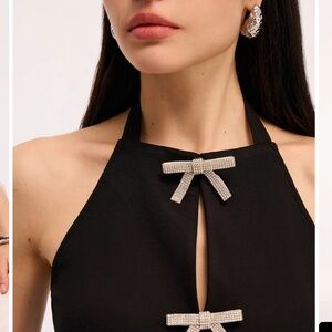 Brand new without tags black halter top featuring stunning rhinestone bow accents and a flattering keyhole front detail.