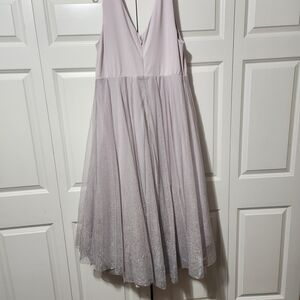 Stylish halter dress with a pale lavender slight ombre design. The silvwr glittwr gets thicker towards the bottom of the skirt. The back is slightly longer than the front. Ideal for elegant events.