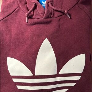 Classic Adidas hoodie in maroon. Features iconic logo. Comfortable and stylish.