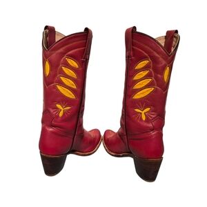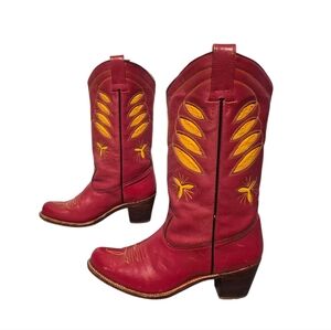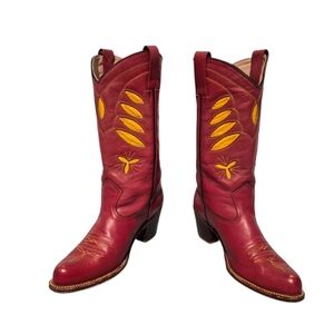 Vintage Sasson Red Leather Yellow Inlay Cowboy Western Boots Women's Size 7B