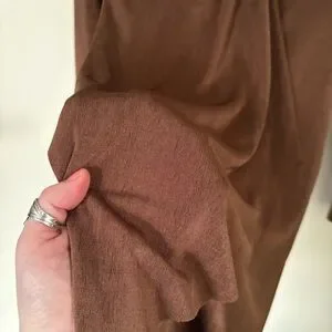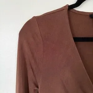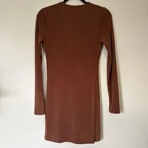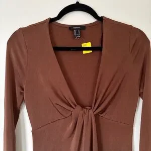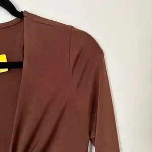 Chic brown dress with long sleeves. Stylish front knot detail and faux wrap. Layered mesh-like fabric. Perfect for versatile wear. Super stretchy. Size medium.