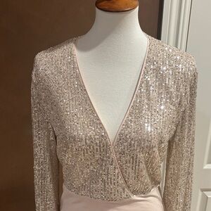Shimmering Bardot bodysuit with a wrap style. Long sleeves and sparkling sequins. Perfect for a night out.