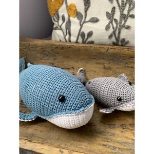 Cute set of 3 Hand Crocheted Plush Mammal Whales. The Momma and 2 babies. Dusty Blue and Grey with White bellies. Measurements in pictures. Smoke Free. You will see on the Grey baby's belly that there is a discolored line. I am not sure where this came from but looks like it can be cleaned. Great for a Nursery, the Marine Biologist in the family, or simply to collect.