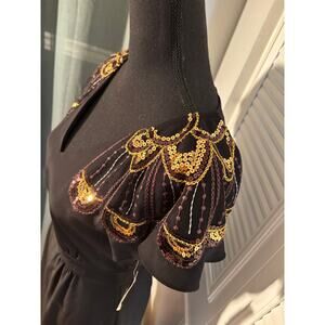Black georgette dress featuring sequin-embellished embroidery on the short flutter sleeves, V-neckline