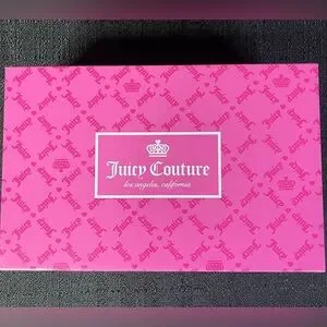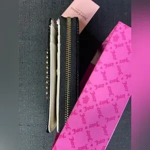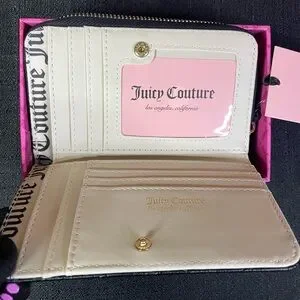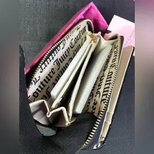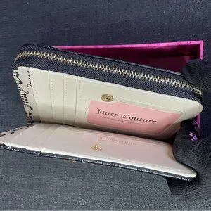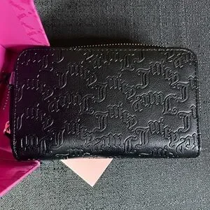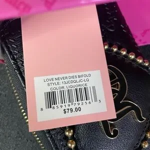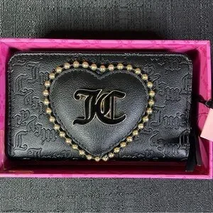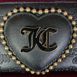 Available is a stylish Juicy Couture black bifold. The official color on tag is Liiquorice. The front features a large gold-tone beaded heart and black raised JC in the center with a gold-tone outline. It has an embossed gothic-style logo pattern throughout the exterior.