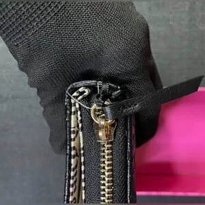 The interior has compartments for cash storage, separate zipped pouch for change, credit card slots, plastic insert for ID. One side closes with a gold zipper and the other with a snap. It has a tan lining with a brown JC logo pattern. There is also a black tassel on the zipper-pull. It is very roomy for storing these important items.
