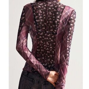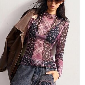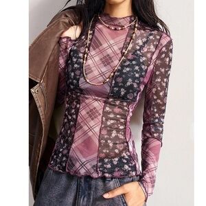 Boho Floral Plaid Print Reverse Stitch Long Sleeve Semi Sheer Top