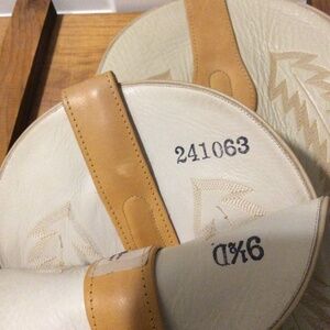 Olathe boots are handmade in Mercedes, Texas, and are known for their high quality and legacy as one of the oldest American-made boot lines. The Buckaroo Boots have taken a turn or two on the hardwood floors two-stepping but have many dances left in them. See pictures for light wear. Mens 9 1/2 D in a light buckskin & creme