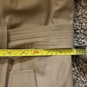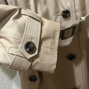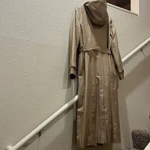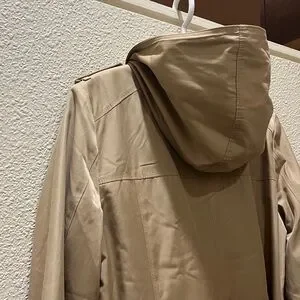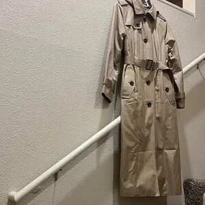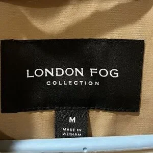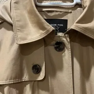 Stylish London Fog water resistant trench coat. Features a classic design with a belted waist and detachable hood. Ideal for versatile wear.