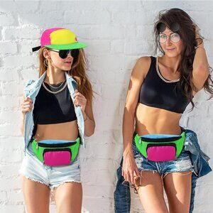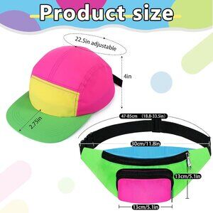 Features: This fun set includes a neon fanny pack with dual zipper pockets, a neon adjustable hat made of lightweight nylon and oxford cloth, round flip-up sunglasses, a shiny gold chain, and a pair of statement earrings. Perfect for adding a vibrant, nostalgic touch to your outfits or as a gift for fellow 80s/90s lovers.