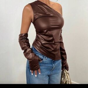 Elevate your style with this chic brown one-shoulder top. Perfect for a night out, it features a sleek design and matching gloves for a bold statement.