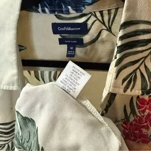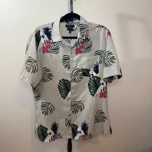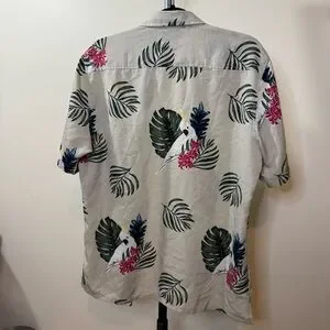 Casual button-down with vibrant leaf and floral design. Perfect for relaxed outings.