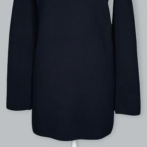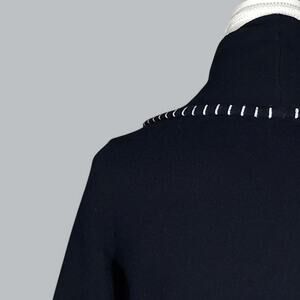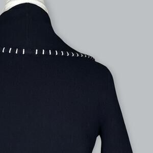 - Sleek Navy Blue knit with contrast white stitching along the front, around the pockets, and across the high collar at the back
