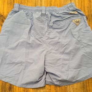 Columbia athletic shorts in a light blue shade. Features elastic waistband and side pockets. Ideal for sports and casual wear. Liner has been removed