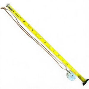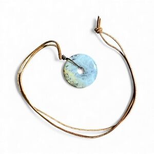 This artisan handcrafted unisex necklace has lovely “lace-like” banding. The colors are soft neutral tones of cream, gray, tan and honey. It is on a long leather brown cord. The cord is knotted but could be unknotted and retied to make a shorter length.