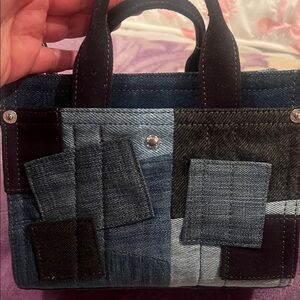 Chic patchwork tote with Coach branding. Features denim and black fabric.
