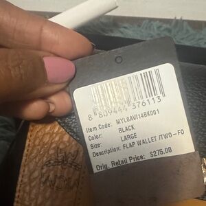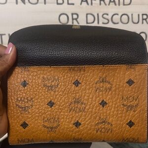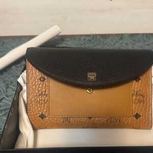 Chic MCM clutch with a sleek black flap and rich brown body. Features iconic logo accents. Ideal for stylish outings.