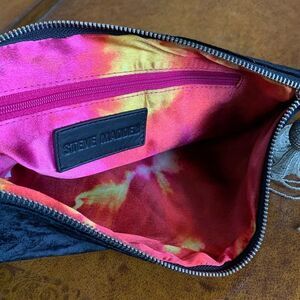Plush, delicious crushed velvet! Steve Madden’s best selling silhouette in a gorgeous black. An extra long tasseled zipper pull dangles from this bags folder silhouette, which can comfortably be styled under your arm or carried as a handheld.