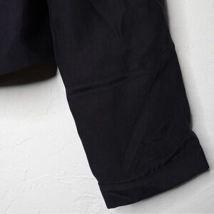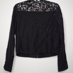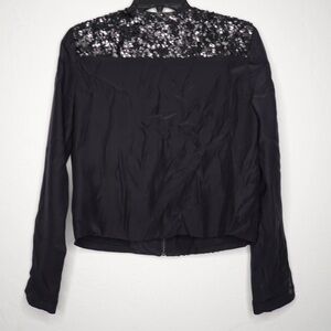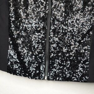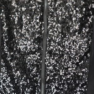 Statement piece from Magaschoni New York – a black 100% silk jacket with striking black sequin embellishments on the front. Features a zip front closure and long sleeves, perfect for adding sparkle to an evening outfit or holiday party look.