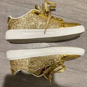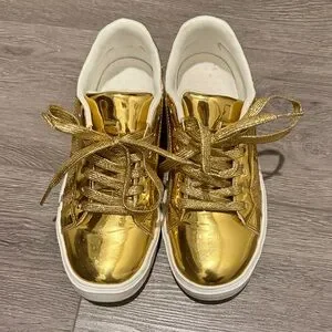 Shiny gold sneakers with white accents. Perfect for a bold look. Only worn twice