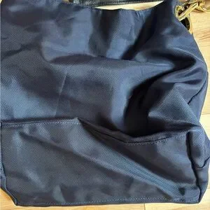 This stylish navy blue shoulder bag is perfect for any occasion. Its sleek design and durable material make it a must-have accessory. The gold accents add a touch of elegance. Great pre owned condition.