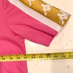 Vibrant pink Kappa T-Shirt dress featuring bold gold Kappa logos. Urban style, mesh like fabric, gold accents.