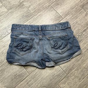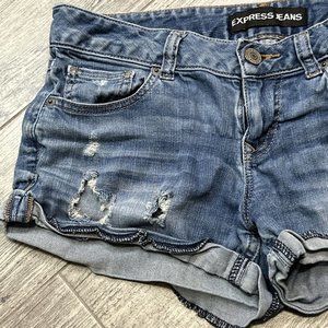 These Express denim shorts are the perfect addition to your summer wardrobe. The light wash and distressed details give them a trendy, vintage feel. The 5-pocket design and zip closure make them practical for everyday wear. Made of a comfortable spandex and cotton blend, these shorts are machine washable and easy to care for. They come in size 2 and have a regular fit. The cuffed style adds a touch of elegance to their casual design. These shorts are made by Express, a well-known brand in women's clothing. They are sold pre-owned, but in excellent condition.