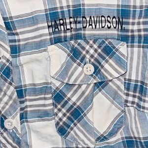 This sleeveless button-down features a soft blue and white plaid print with the iconic Harley Davidson logo embroidered above the pocket. Perfect for a coastal cowgirl look, layered over a tank, or tied up with denim shorts for a summer festival vibe.