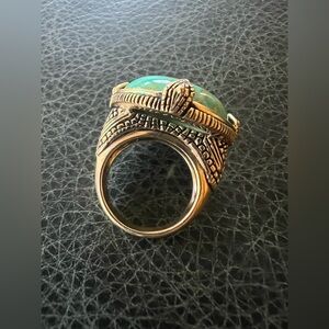 Crafted with meticulous attention to detail, this statement ring features a lustrous golden bronze band adorned with a striking round genuine green turquoise centerpiece stone. The turquoise center measures 1 inch in diameter. Hand-finished to perfection, this ring is a substantial yet wearable addition to any sophisticated jewelry collection.
