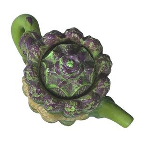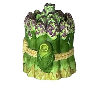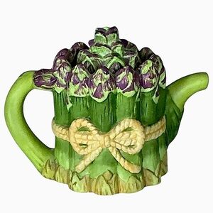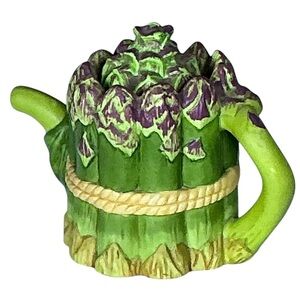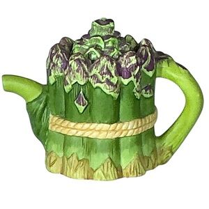 A sweet vintage Avon miniature Teapot collectible Asparagus Bunch in a teapot shape with notched lid and painted in vibrant colors with realistic intricate 3D details in a Fine Porcelain Bisque